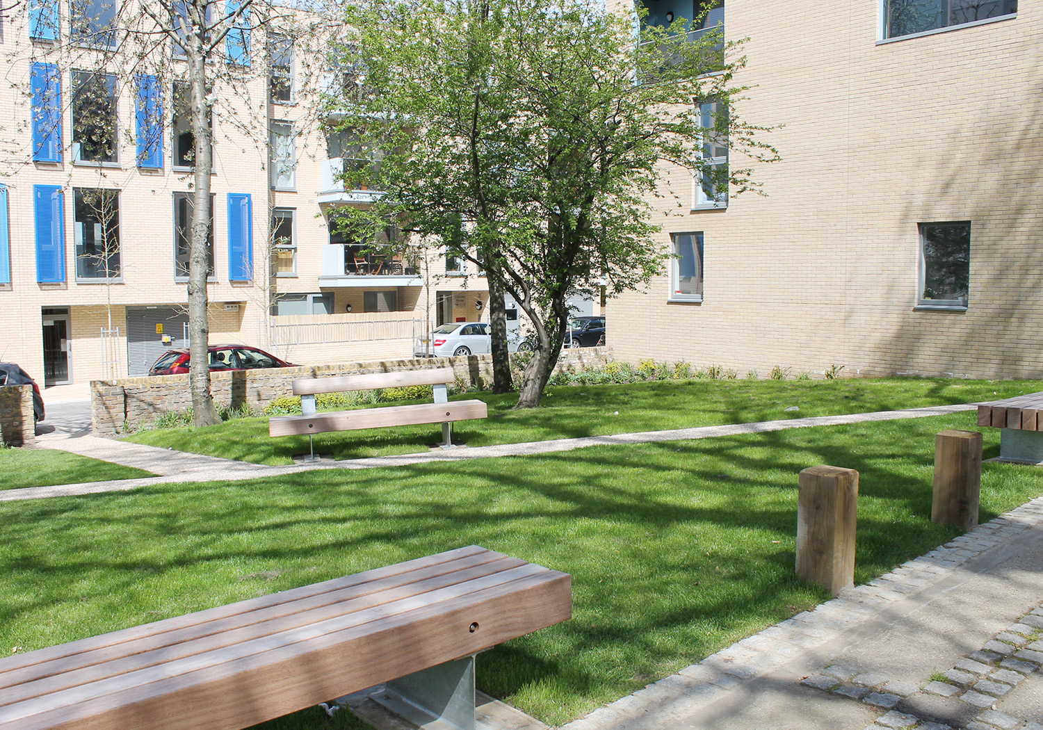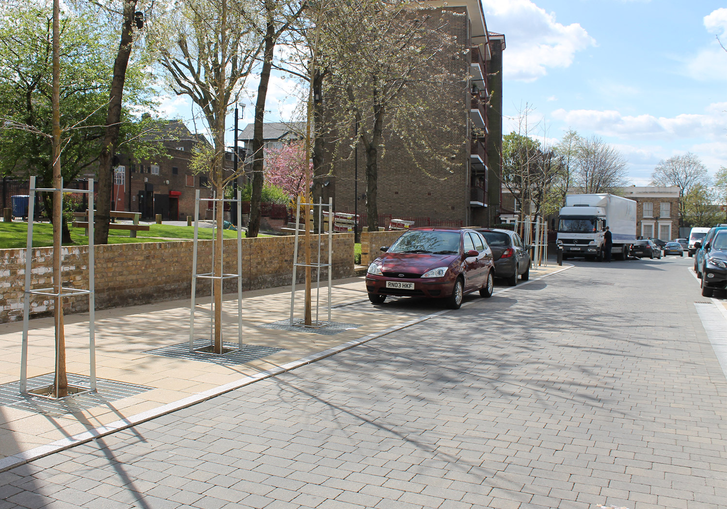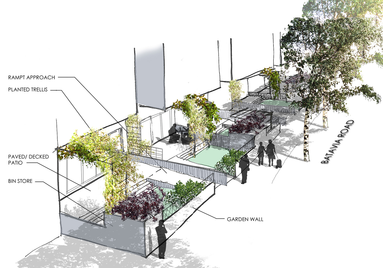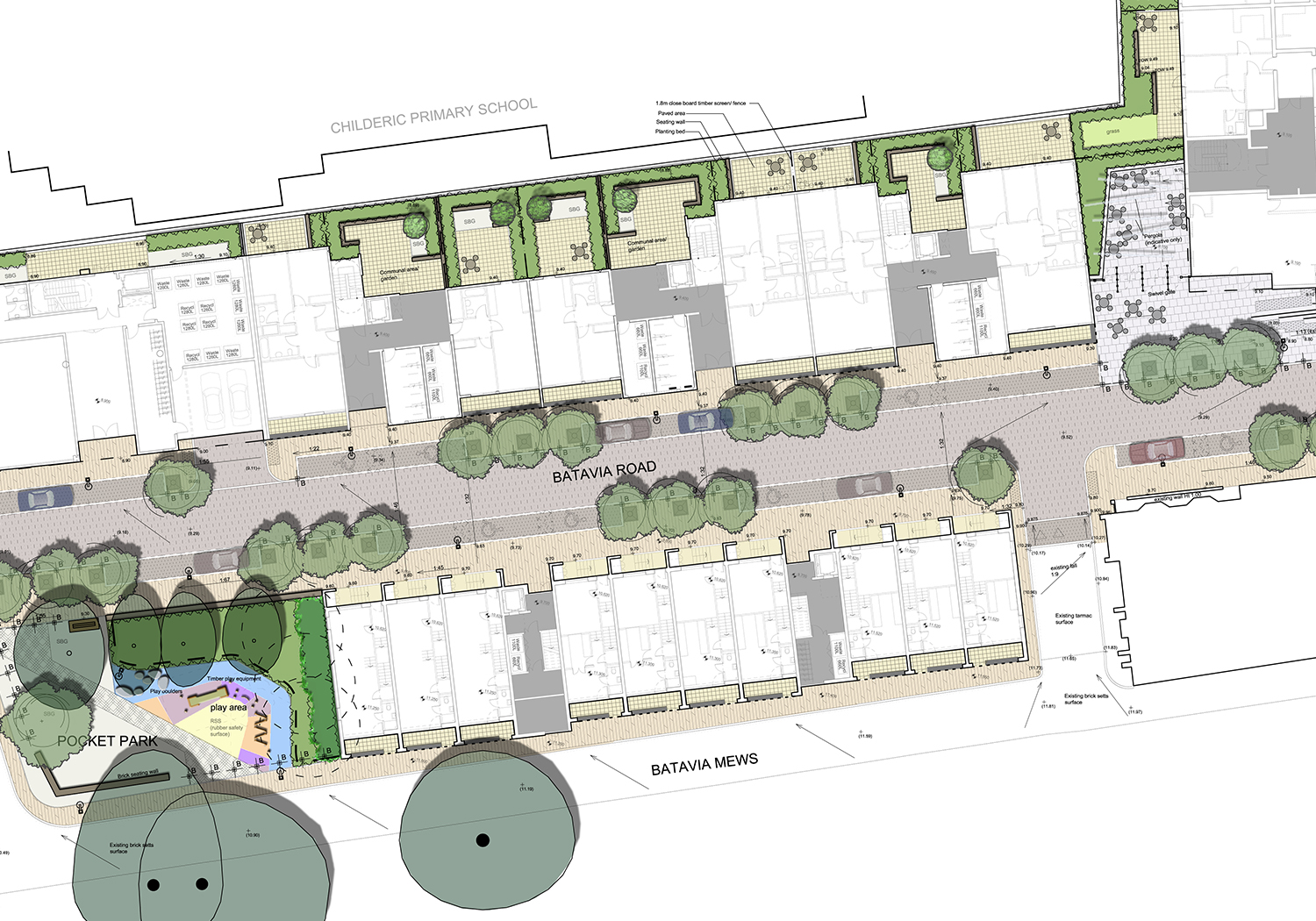 Preparation of landscape and urban design proposals for the redevelopment of Batavia Road, Lewisham to include a mixture of new high-density residential units and business uses. The road was identified as a priority route for public realm improvements as it lies on the strategic route between Deptford High Street and New Cross. The scheme  delivered private gardens facing onto the street, a shared road surface with tree planting, an outdoor public café space, roof gardens, and direct links to a public park.