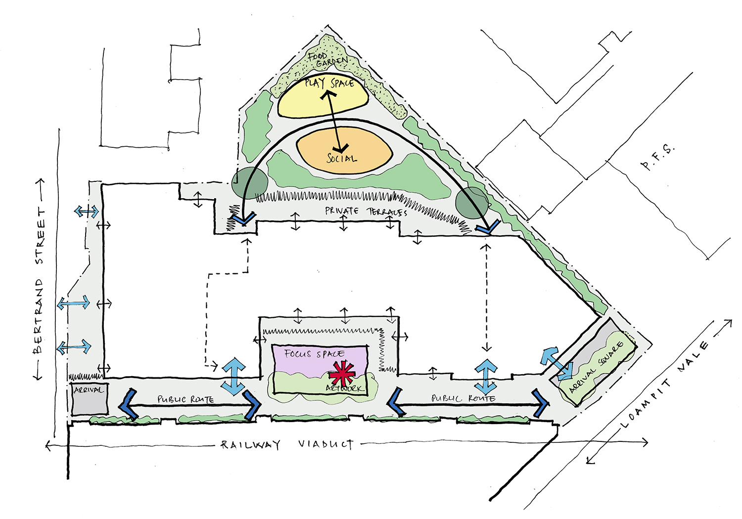 Landscape proposals to support a detailed planning application for a high density, mixed tenure housing scheme in Lewisham. Working closely with architects to develop an innovative and sustainable residential scheme alongside the Renaissance development in Lewisham town centre. The scheme provides new public linkages, a pedestrian footpath and cycleway as well as community food gardens and play space.