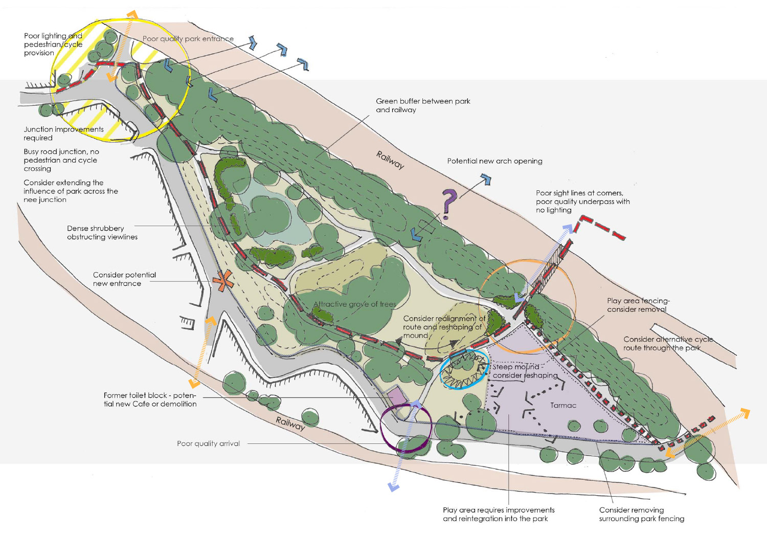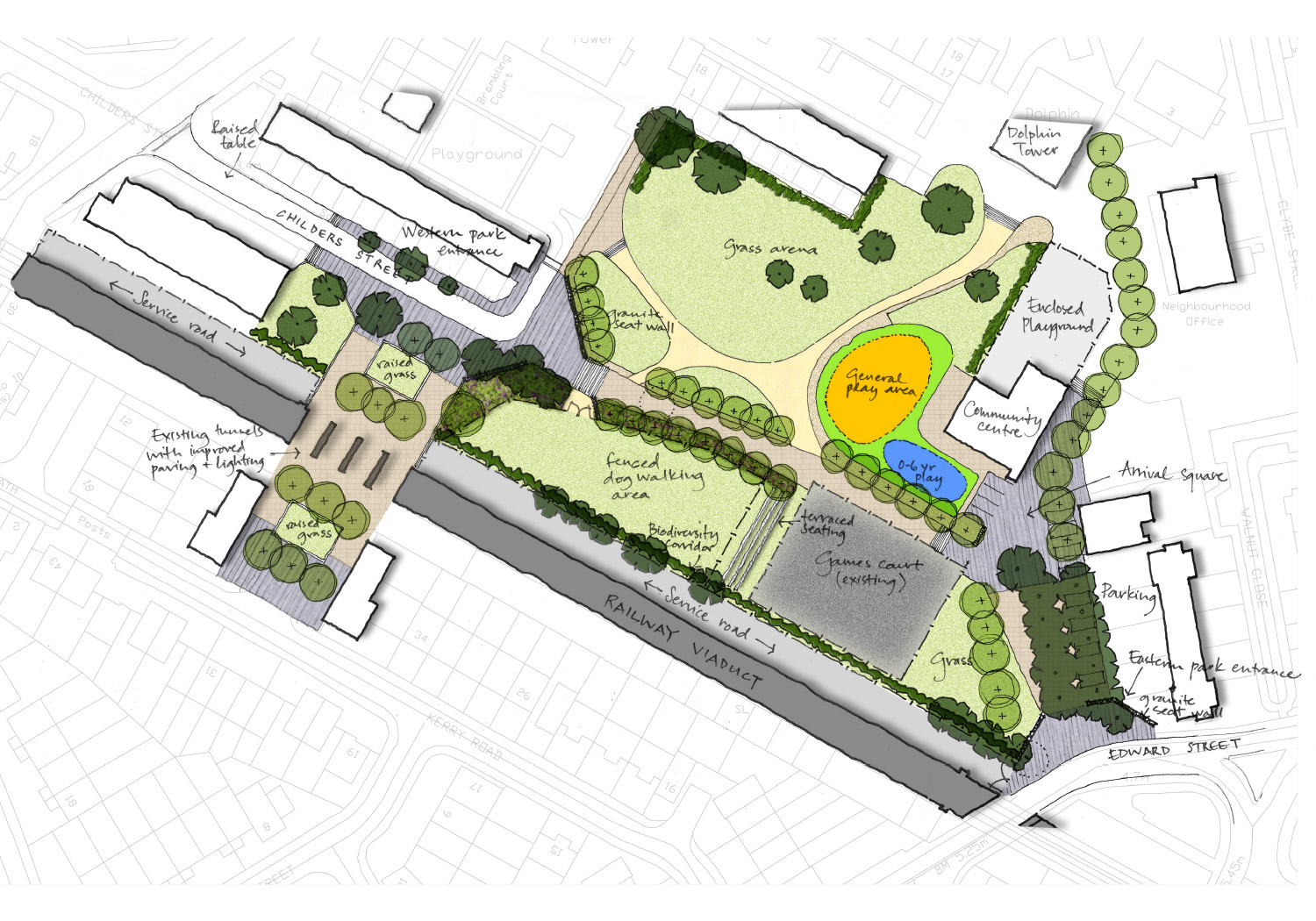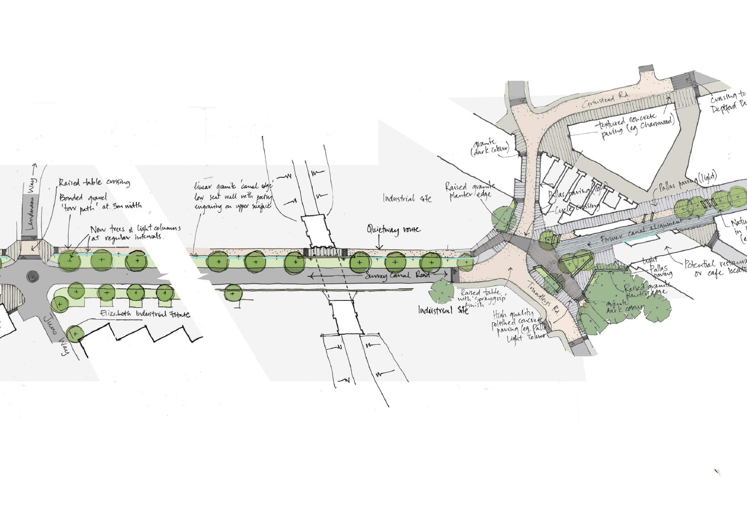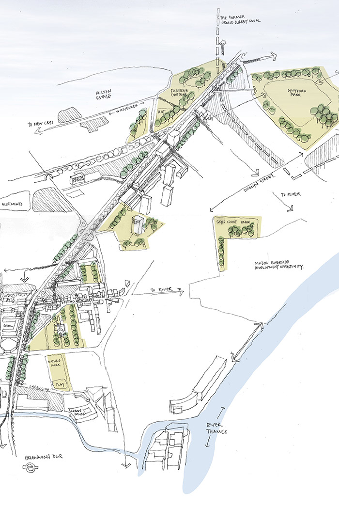 Public realm design advice to assist Lewisham Council on their pilot project for the Mayor of London The Waterloo to Greenwich Quietway (also known as Q2) is one of two pilot projects funded by the Mayor’s office that, if successful, will be rolled out across the city over the next ten years.  The proposed route for Q2 makes use of quiet streets and passes through car free areas that includes a number of parks and open spaces.  Funding from the Mayor’s office for improved crossings, entrances and routes for cycling will be combined with funding from a number of other sources to make other park improvements at Folkestone Gardens.