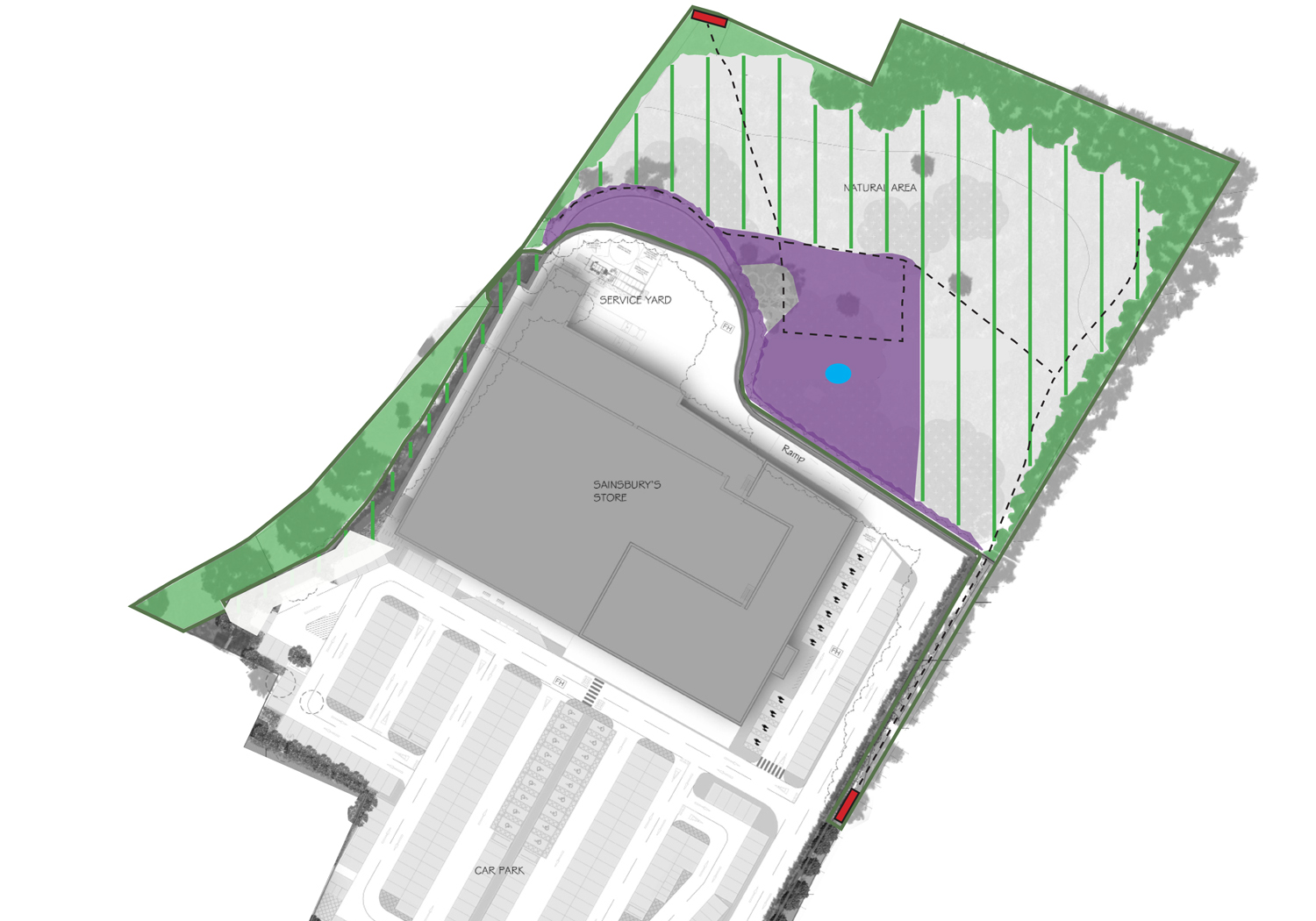 New build store within an old quarry and former carpet factory site, situated on edge of Sudbury.  Whilst providing a well contained site, it had a number of constraints that required careful design and consultation, including an area of local biodiversity value, the presence of Slow Worms, Common Lizards and Sulphur Clover, close proximity to the River Stour and the local designation of Special Landscape Value, TPOs and overlooked by a number of residential properties.  The scheme involved providing a phase 1 habitat survey, protected species survey, ecological mitigation strategy, management plan, tree survey and arboricultural implications assessment, landscape and visual assessment, implementing the ecological mitigation strategy and design of soft landscape proposals.  The project also involved TLP being involved in consultation with the Wildlife Trust, local planning authority, Town Council, local residents and attendance at a public exhibition.