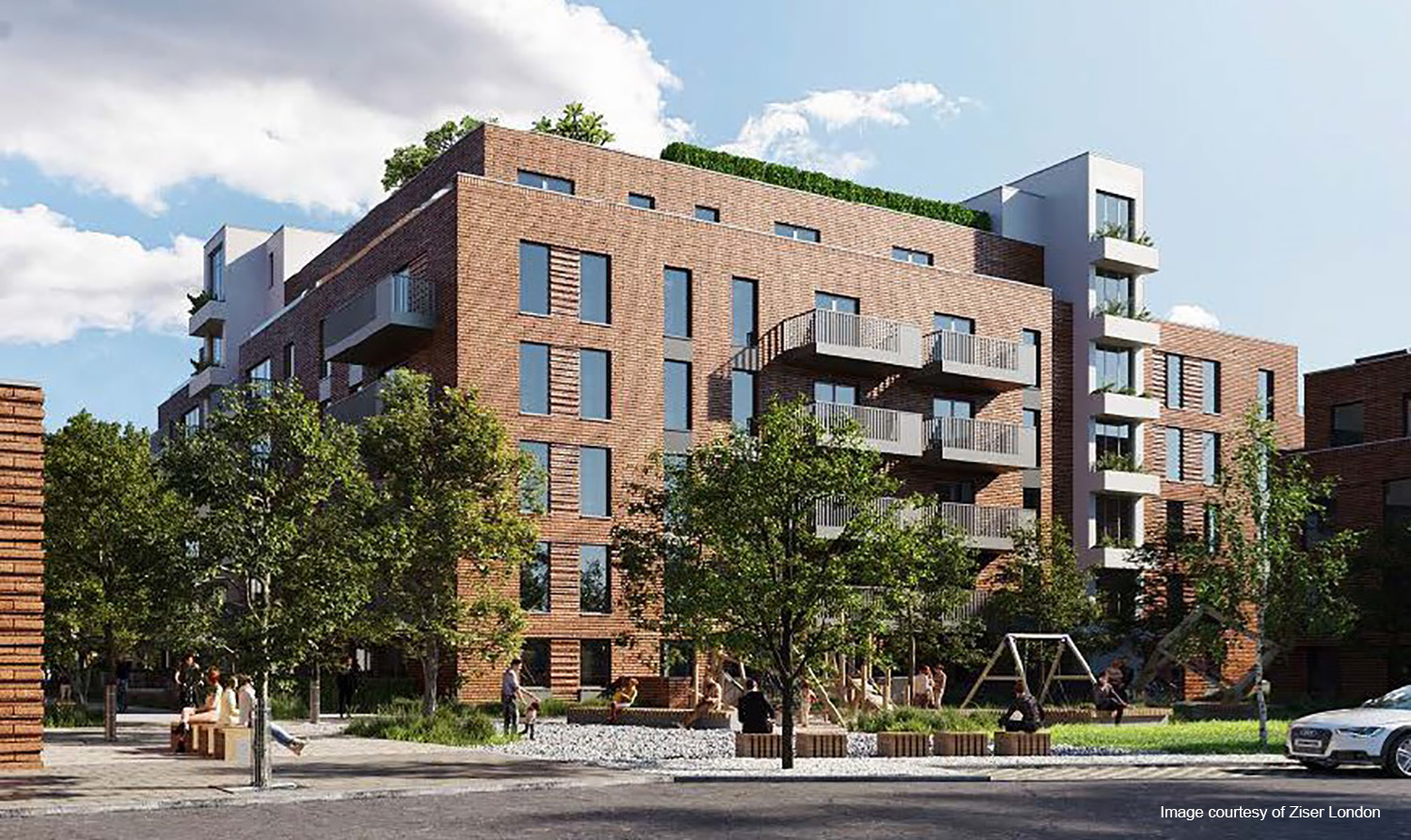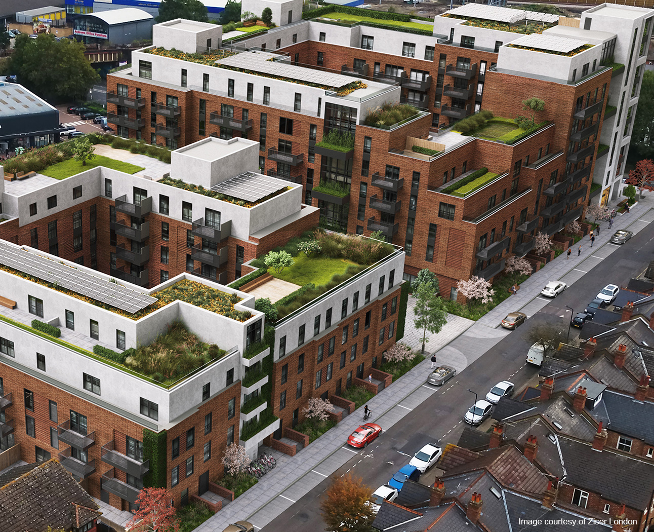 The GLA’s Urban Greening Factor target score was easily achieved by incorporating a range of sustainable ‘greening’ options including permeable paving, rain gardens, biosolar, extensive and intensive green roof planting as well as over 100 new trees across the development. The scheme included multiple roof and courtyard gardens, as well as the creation of a home zone style ‘Park Street’ that connects a new open space to the surrounding residential street. With rain gardens, street trees, planting, seating and incidental play items, the new housing will face onto the new Park Street to create a neighbourhood space for play and amenity.