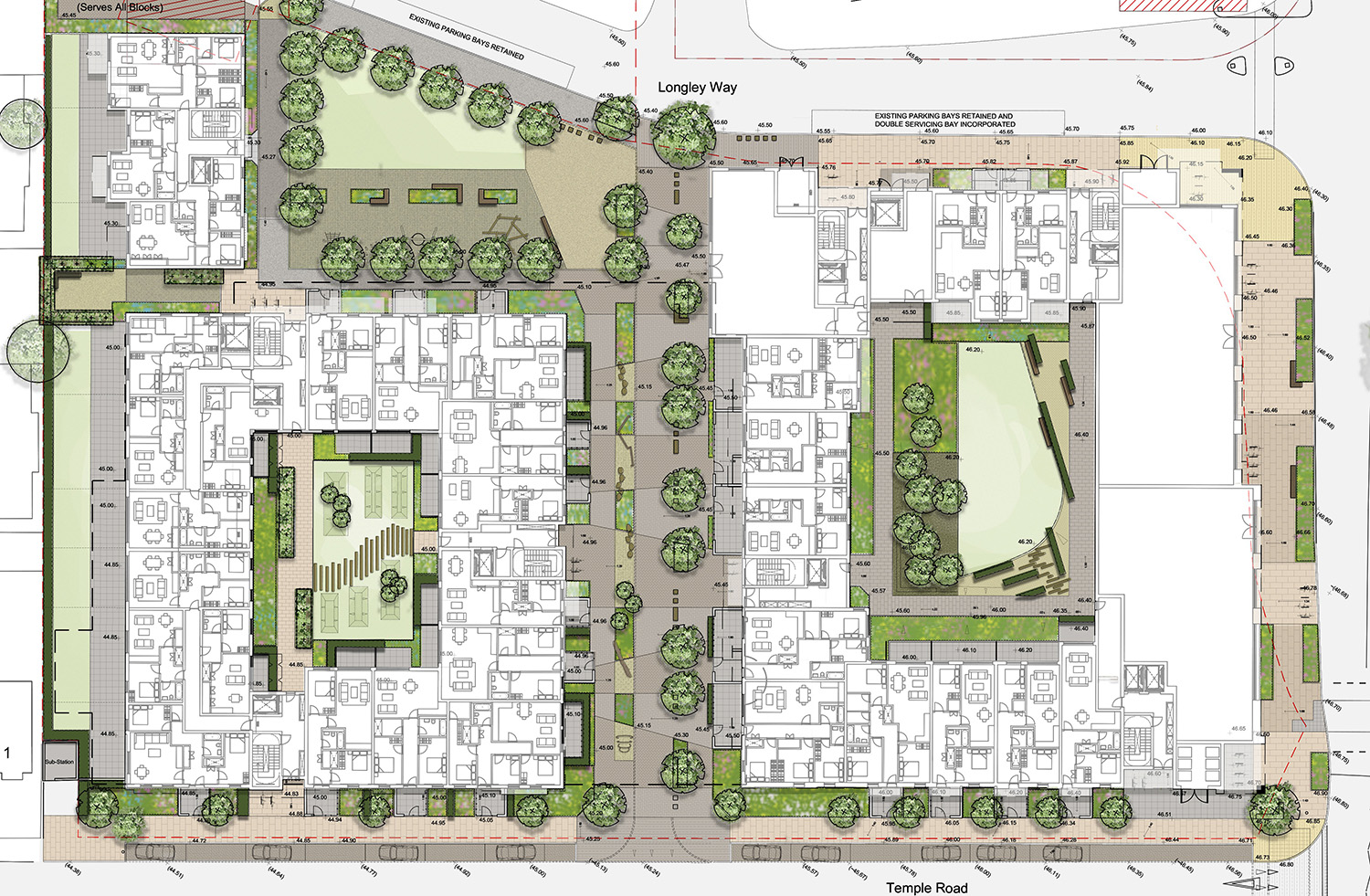 A mixed-use residential scheme, providing 238 new homes through the transformation of an existing ‘big box’ retail site in Cricklewood, London, while restoring the site’s relationship with the high street (Cricklewood Broadway). Our masterplan and landscape and public realm strategy encouraged links between the site and local green spaces to create connected, liveable streets and spaces.