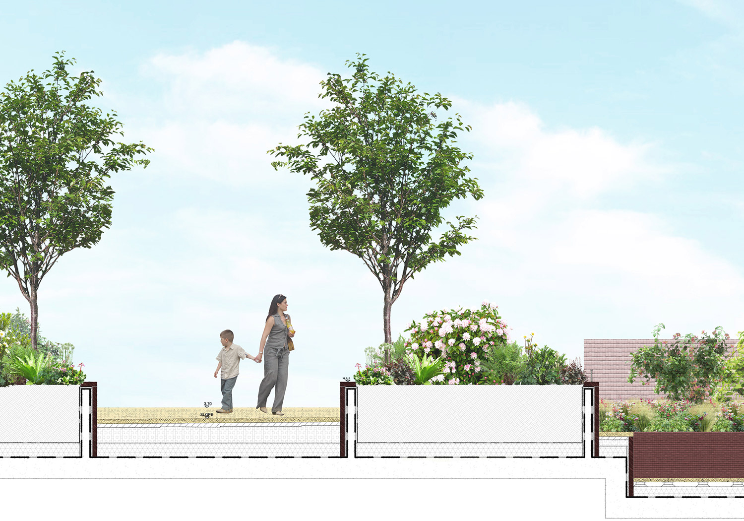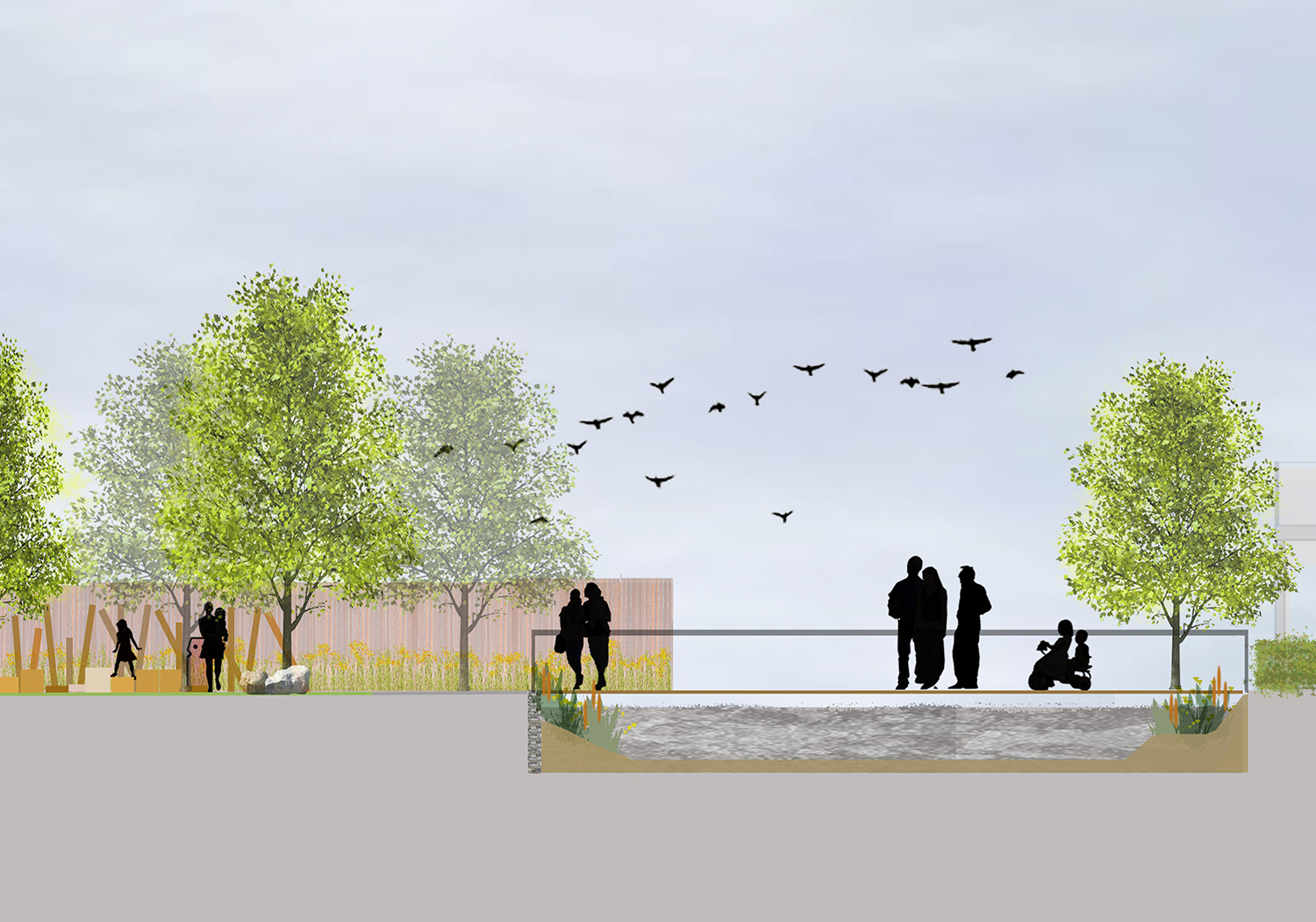 Landscape proposals to support a detailed planning application for a large-scale mixed-use housing scheme in Sutton, south-west London. The design aim was to unite two large development sites on either side of the River Wandle, including removal of concrete canalised edges, re-profiling of river banks, creation of a rich habitat corridor along river edges, and dredging and recreation of a historic millpond. Working closely with two architects and the wider design team, the practice developed an innovative and sustainable scheme within Hackbridge, considered to be London’s greenest neighbourhood. The scheme creates a unique riverside setting for the new buildings and brings significant green infrastructure improvements by opening a new section of the Wandle Trail, providing new pedestrian footpaths and cycleways.