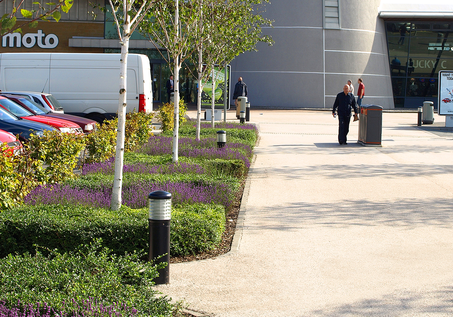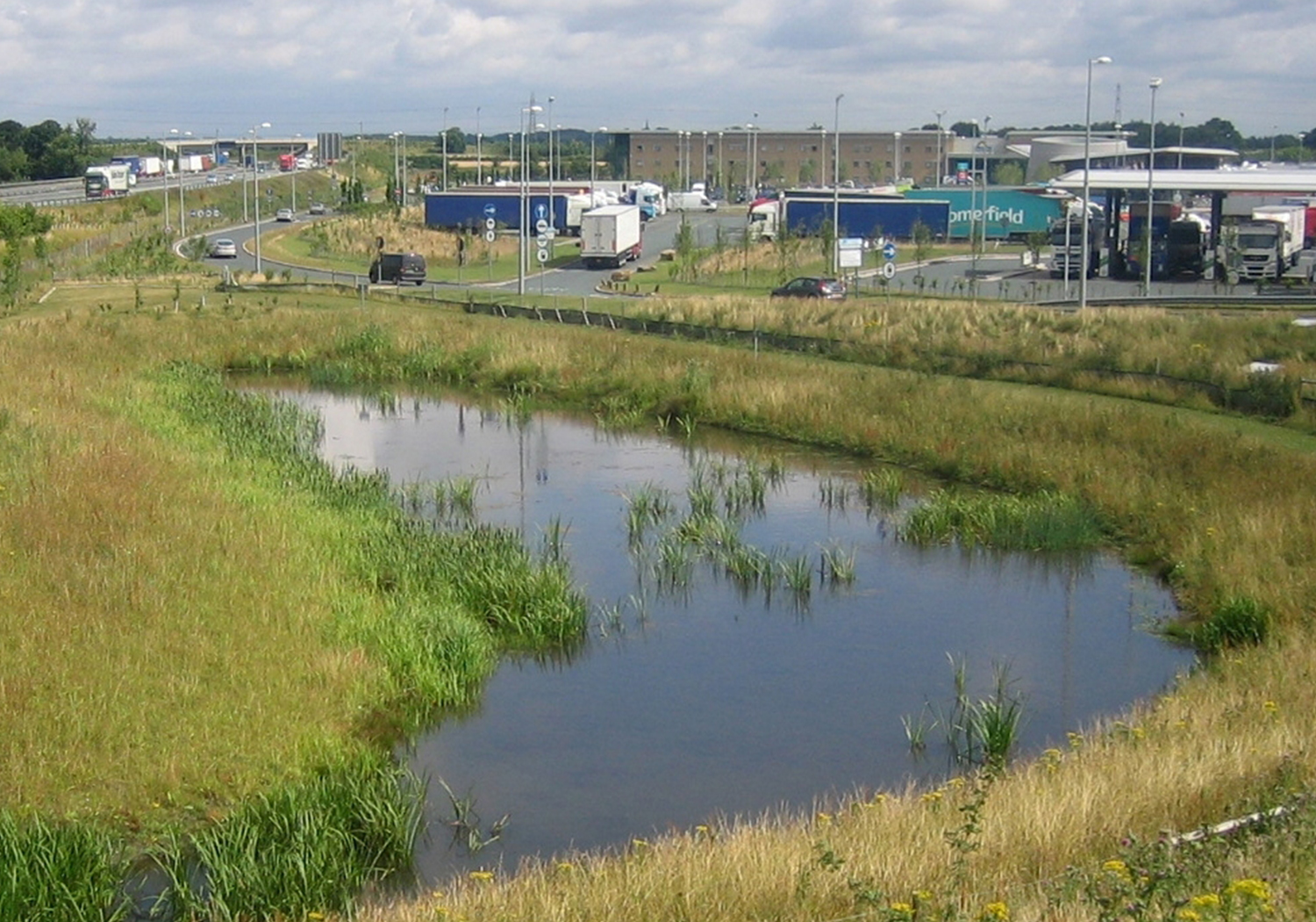 A new Motorway Service Area at Junction 46 of the A1(M) including a 126 bed hotel and extensive areas of structural landscape. The site was designed to use the very latest technology to reduce carbon emissions as well as provide ponds and woodland for wildlife habitats. Sustainable urban drainage has been designed into the scheme through the inclusion of swales and balancing ponds. Woodland, scrub and wildflower meadow habitats specifically designed for the local geological conditions (magnesium limestone). The hard landscape to the frontage of the amenity building has been designed for high pedestrian activity with open direct paths to the building retained at all times. Specimen Himalayan Birch for avenues directing pedestrian traffic through the space. Deterrent paving in the form of granite setts has been included around the amenity building to aid security and to reflect local geology.